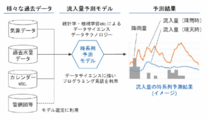 ■概要 運転管理に有用な流入量予測システムを構築するため、以下に取り組む。 ① 気象等のオープンデータと流入量の相関関係を調査し、予測精度に影響を与える入力項目を抽出 ② データの構造評価や前処理を実施し、AI を活用した流入予測における課題を明確化 ③ AI に関するオープンソースを活用し、最適な流入予測モデルを構築 |