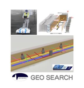 ■概要 二種類の探査技術を用いる。地中レーダ探査では、地中レーダ測定器を1m/sec 程度の速度で移動させ、アンテナで送受信した信号を測定器本体でデータ処理し、探査状況をモニター画面に表示させながら記録する。水平磁気探査では、磁気センサを地表から約10cm 程度離れた位置に保持し、探査範囲を1m/sec 程度の速度で歩いて地表面下に埋没する鉄類を探査する。 ■特長 舗装路では地中レーダ探査を行い、未舗装路等では水平磁気探査を用いるなど、フィールドに合わせた探査が可能。 |