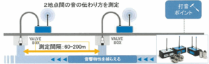 調査対象の水道管の両端にセンサを設置し、非開削管厚調査技術(ePulse)を用いて管内に伝わる音の伝播速度等から管厚を算出し、実測した管厚と算出結果を比較し精度検証を行います。