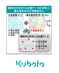 ■研究目的 福岡市が所有する各種データをAI技術で解析し、水道管路の老朽度評価の予測精度向上を図るとともに、適切な更新率を提案 ■研究概要 (1)福岡市が所有する各種データをAI技術で解析し、自社開発した水道管路の老朽度評価方法の更なる予測精度向上を図る。 (2)水道管路の更新優先順位付け、及び管路更新による効果を長期的に評価することにより、適切な管路の更新率を提案する。 ■特長 ・約50年間にわたる日本全国の管体の腐食深さ及び土壌の調査データを基に、高精度に漏水事故率を算出する手法を開発 ・その結果を基に更新優先順位を決定し、将来の漏水事故件数を大幅に低減できる適切な更新率を提案 |