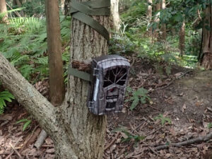 イノシシ多発エリアに固定の赤外線式センサーカメラを設置し、イノシシの行動範囲を把握したうえで、捕獲用のわなを設置しています。