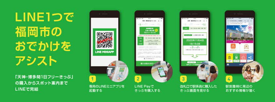 福岡市営地下鉄の特定エリア(天神~博多間)1日乗り放題企画きっぷをLINEミニアプリ上で購入し、駅改札窓口で乗車券面(モバイル上の確認画面)を提示することで乗車できます。
